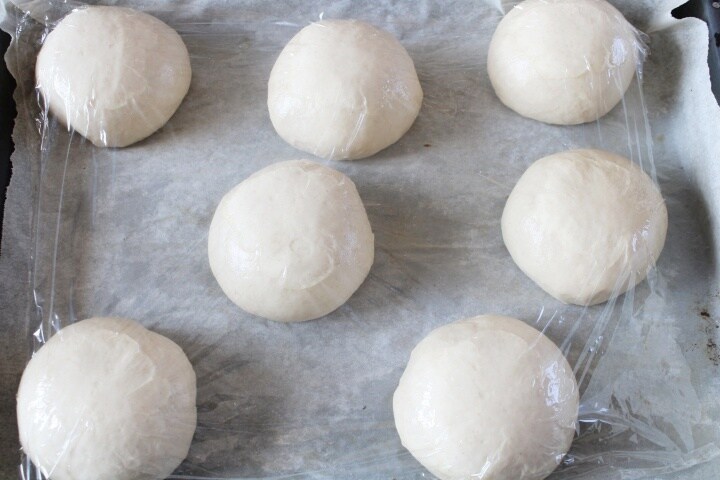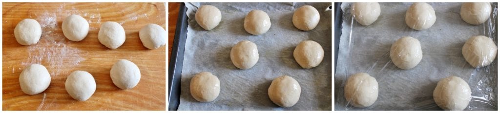 Faites des pliages, puis roulez bien la pâte jusqu’à former des boules que vous laisserez lever couvertes, dans le four éteint, avec la lumière allumée, pendant environ 1 heure. Les voici après la levée.