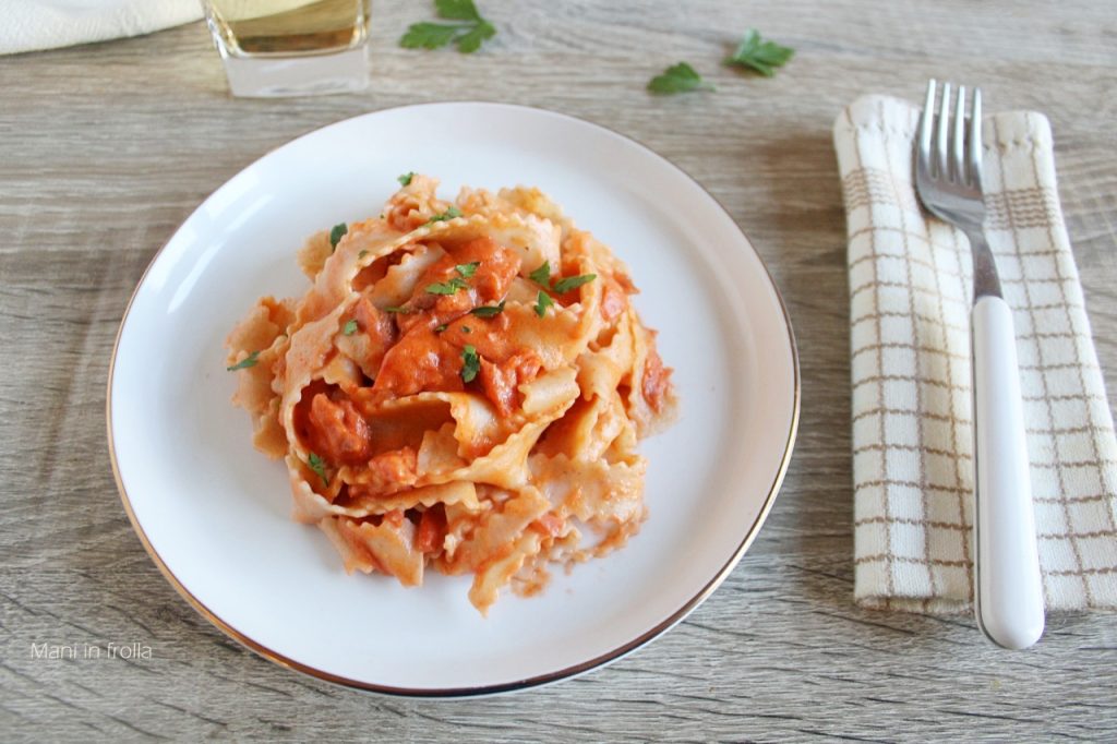 J’ai déglacé avec le vin blanc, en le laissant bien évaporer, et immédiatement après, j’ai versé la purée de tomates. J’ai laissé mijoter la sauce pendant quelques minutes puis j’ai ajouté la crème, en remuant jusqu’à obtenir une belle crème.