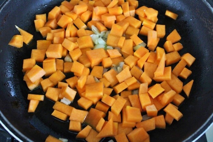 • Tout d’abord, pelez la citrouille et coupez-la en petits dés : de cette manière, elle cuira plus vite. Ensuite, mettez sur le feu une poêle avec l’huile d’olive extra vierge, ajoutez l’oignon haché et la citrouille en dés et faites-les revenir quelques minutes à feu vif.