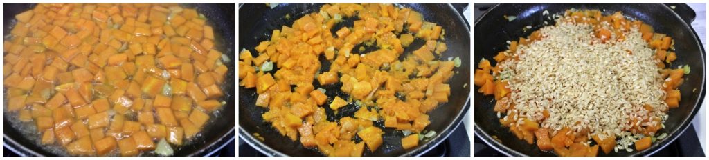 La préparation est très simple : j’ai fait revenir l’oignon et la citrouille (coupée en petits cubes) dans la poêle avec un peu d’huile, puis j’ai ajouté le riz, je l’ai fait griller, je l’ai fait déglacer avec le vin blanc et ensuite, je l’ai fait cuire avec la citrouille, en ajoutant le bouillon, une louche à la fois.