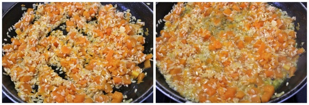 • Ajoutez une louche de bouillon chaud et laissez-le évaporer, écrasez légèrement la citrouille avec une cuillère en bois, puis ajoutez le riz, faites-le griller quelques minutes avec la citrouille et ensuite, déglacez-le avec le vin blanc.