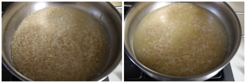 La préparation est très simple : j’ai fait fondre l’oignon dans la poêle avec le beurre et un peu d’huile, puis j’ai ajouté le riz, je l’ai fait griller, je l’ai déglacé avec le vin blanc et ensuite je l’ai fait cuire, en ajoutant le bouillon, une louche à la fois.