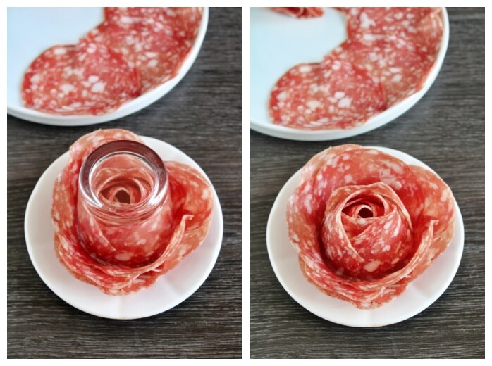 Prenez un verre (le mien mesure 6 cm de diamètre) et commencez à disposer la première tranche de saucisson sur le bord, exactement à moitié, puis continuez avec deux autres comme sur la photo.