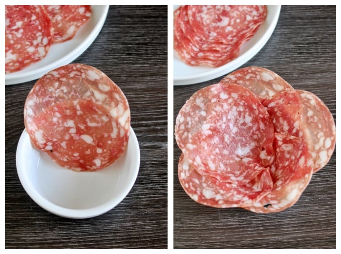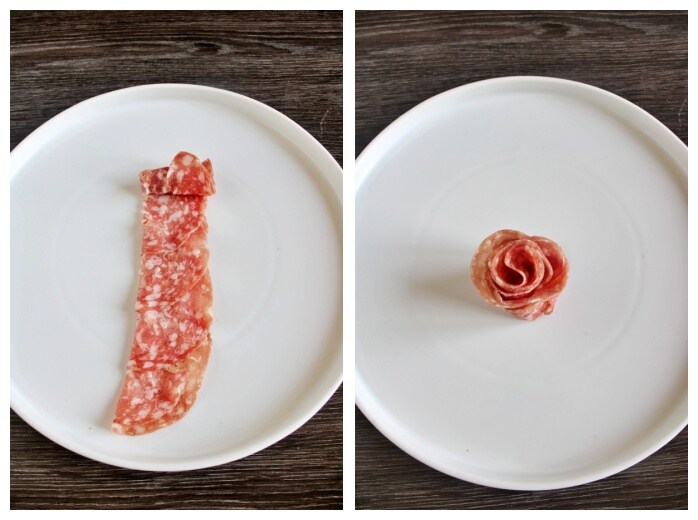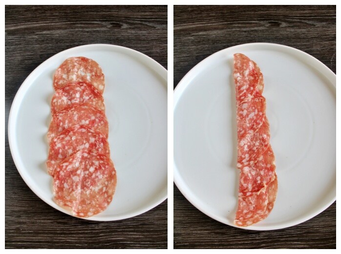 Le dernier type est très simple. Disposez 5 tranches de saucisson (ou 6, comme vous préférez) légèrement chevauchées et fermez en livre, pour obtenir une bande.