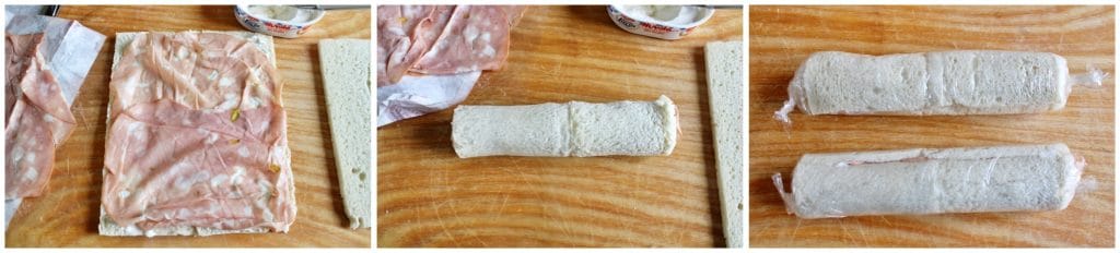 Ensuite, recouvrez le fromage avec la mortadelle et roulez le pain du côté le plus court et enveloppez les roulés obtenus avec le film alimentaire. Mettez-les au réfrigérateur pendant au moins 1 heure.