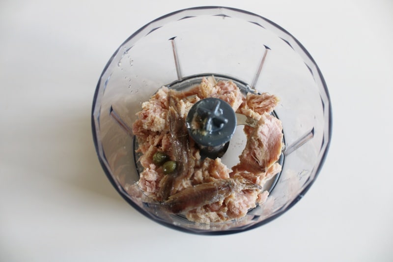 • Mettez dans un mixeur le thon égoutté, les câpres, les anchois, le persil haché et la mayonnaise, et mixez le tout pour obtenir une préparation homogène.