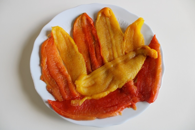 • Une fois cuits, mettez-les dans un sac en papier ou dans un récipient avec un couvercle et laissez-les refroidir pendant environ 10 minutes : cela facilitera le retrait de la peau grillée. Éliminez la peau, le pédoncule et les graines internes. Coupez les poivrons propres et secs en larges bandes d’environ 3 cm.