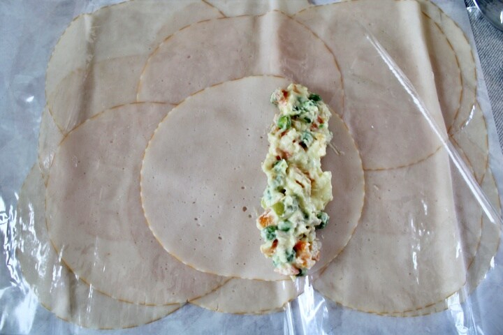 La préparation est très simple : une fois que vous aurez préparé la salade russe, il ne reste plus qu’à la déposer avec une cuillère sur les tranches de poitrine de poulet rôti, les rouler délicatement, les fermer avec quelques brins de ciboulette et les servir. Facile non ?