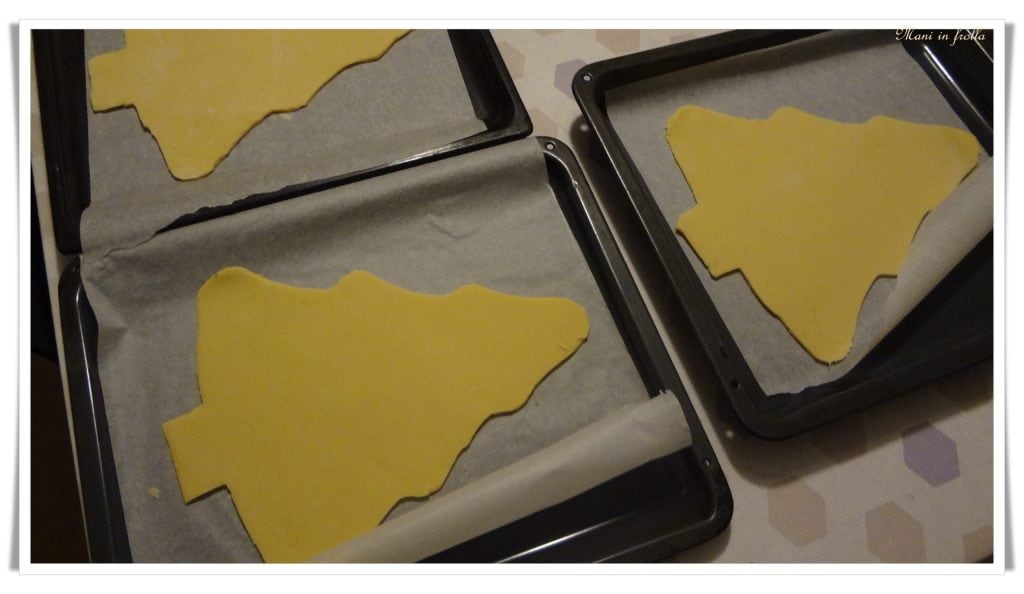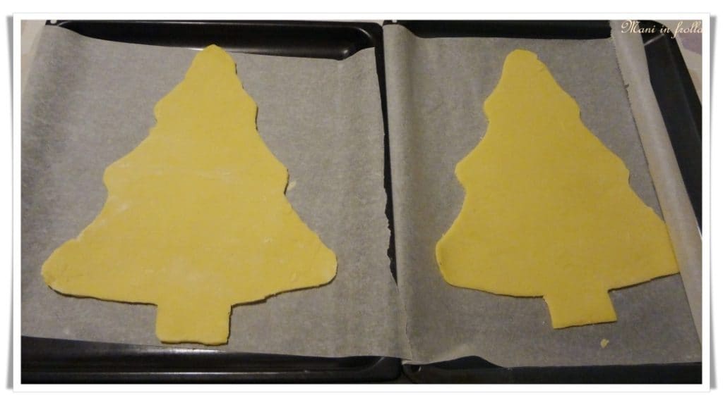 Transférez ensuite la pâte sur un plan légèrement fariné, formez une boule, enveloppez-la dans du film alimentaire et placez-la au frigo pour 30 minutes. Pendant ce temps, découpez la forme d’un sapin de Noël sur une feuille de papier sulfurisé.