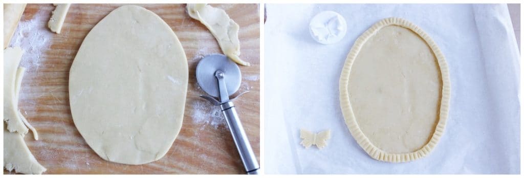 – Pour donner la forme à la tarte, je n’ai pas utilisé de moules, j’ai découpé un ovale directement sur la pâte sablée avec une roulette à pizza. Si vous souhaitez être plus précis, vous pouvez imprimer la forme d’un œuf de Pâques sur une feuille de papier sulfurisé et l’utiliser comme modèle.