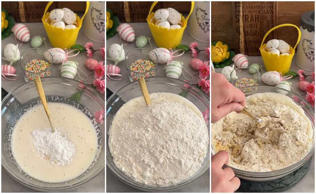 On y est presque ! Incorporez la levure, la farine et mélangez d’abord avec une fourchette puis avec les mains directement dans le bol.