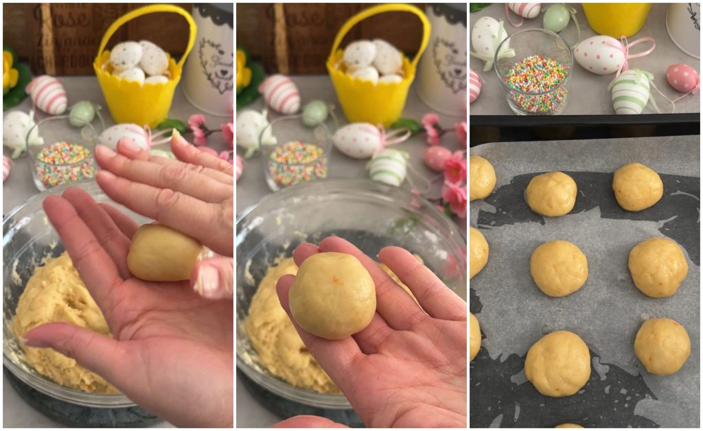 Continuez de la même manière jusqu’à ce que toute la pâte soit terminée. À ce stade, avec vos doigts, appliquez une légère pression sur la surface de tous les biscuits pour les aplatir.