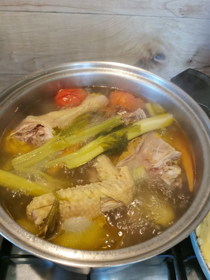 Ajustez le sel et laissez cuire à feu doux pendant au moins 2 heures. En fin de cuisson, filtrez le bouillon avec une passoire.