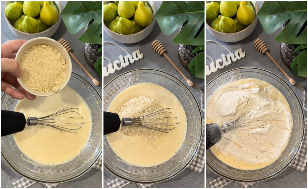 Incorporez la farine d’amandes, la farine 00 et enfin la levure chimique, ces deux derniers avec un tamis pour éviter les grumeaux.
