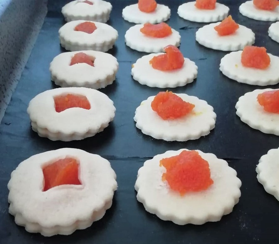 • Mettez une demi-cuillère à café de confiture au centre du biscuit. Découpez d’autres disques de pâte sablée, cette fois avec un trou au centre. Réalisez-le avec un autre emporte-pièce plus petit. Superposez le second biscuit sur le premier.