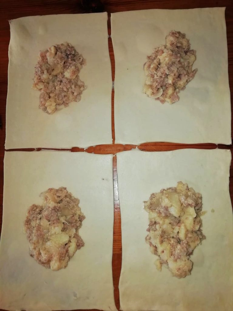 Puis découpez des rectangles d’environ 15×20 cm chacun et déposez au centre 2 cuillères à soupe de garniture.