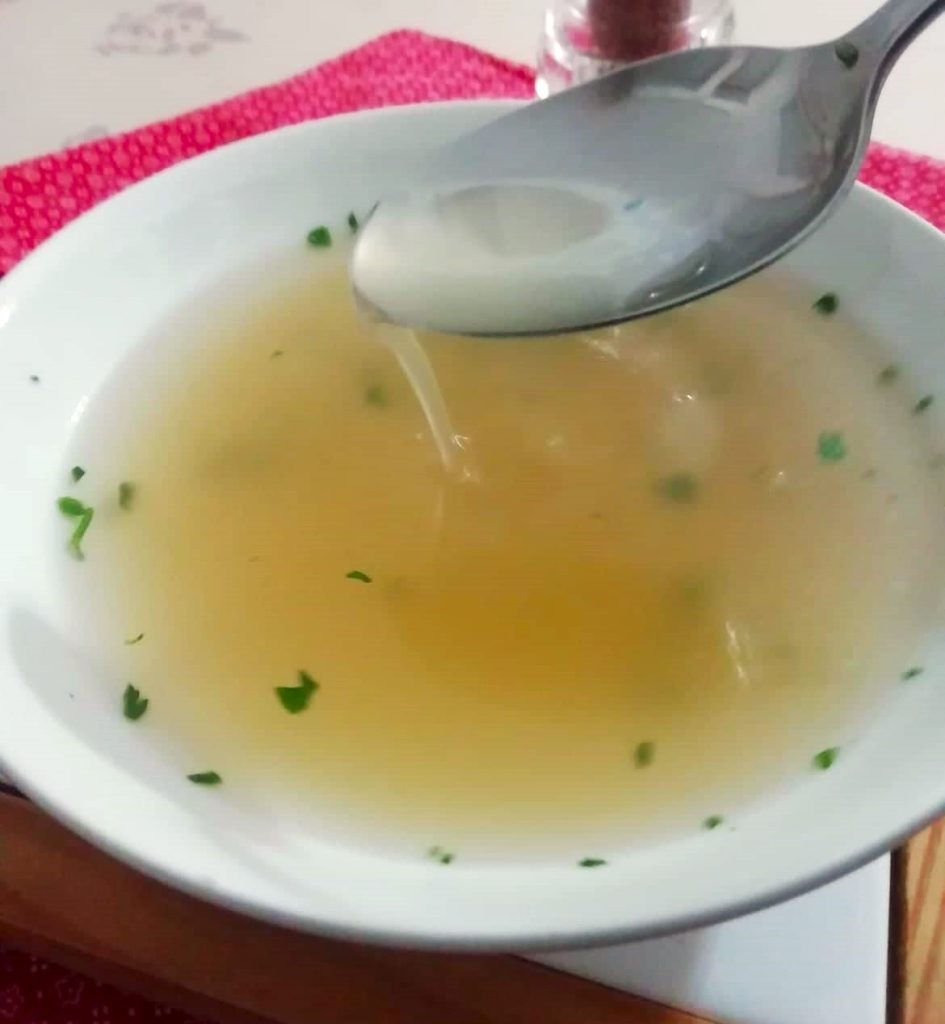 Le gras solidifié que vous voyez à la surface du bouillon doit être éliminé délicatement avec une écumoire. Vous obtiendrez ainsi un bouillon de viande clair et moins gras, prêt à être dégusté.