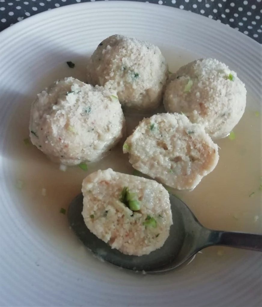 Les canederli au fromage sont un plat principal simple, d’origine paysanne, fait avec des ingrédients de récupération. Le pain rassis est ramolli avec du beurre et du lait et assaisonné avec ce qu’on a à la maison, puis ils sont bouillis dans du bouillon et enfin servis avec une pincée de fromage râpé et de ciboulette.