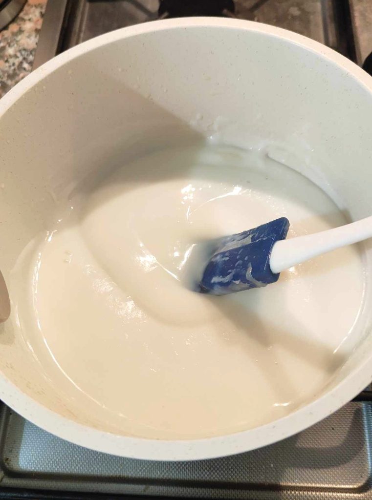 Mettez la casserole sur le feu à feu doux et faites cuire le mélange en remuant avec une spatule ou un fouet, jusqu’à ce qu’il épaississe. Cela prendra environ 3-4 minutes.