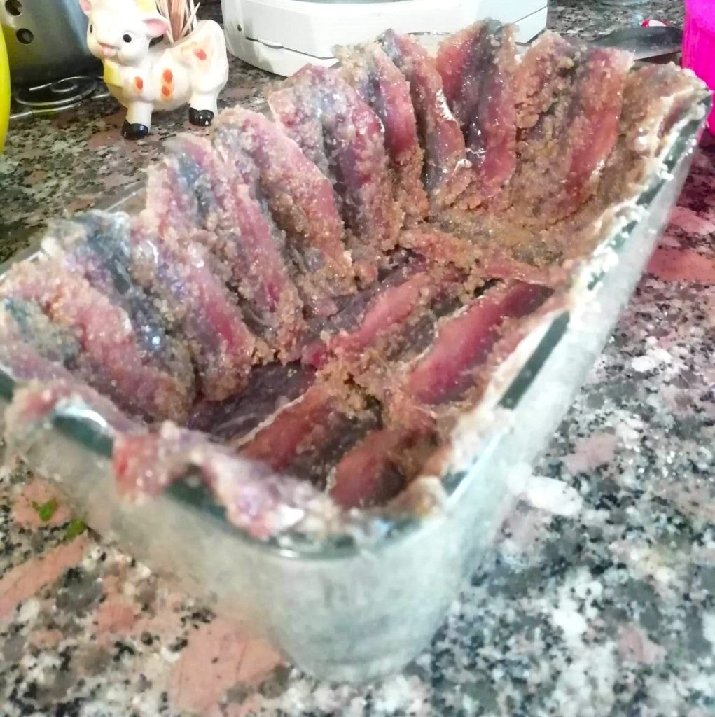 • Tapissez le plat avec les sardines à la fois au fond et sur les quatre côtés. Mettez de côté un tiers des sardines pour recouvrir la surface du gâteau.