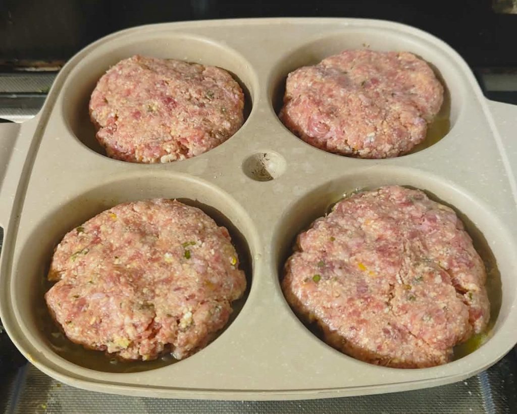 Laissez-les de côté à température ambiante quelques minutes avant la cuisson.Si vous avez la poêle spéciale pour pancakes (cliquez sur ce lien pour la voir) utilisez-la aussi pour cuire les médaillons de viande, ils cuiront mieux et garderont leur forme. Si vous n’en avez pas, une poêle antiadhésive de qualité convient très bien.
