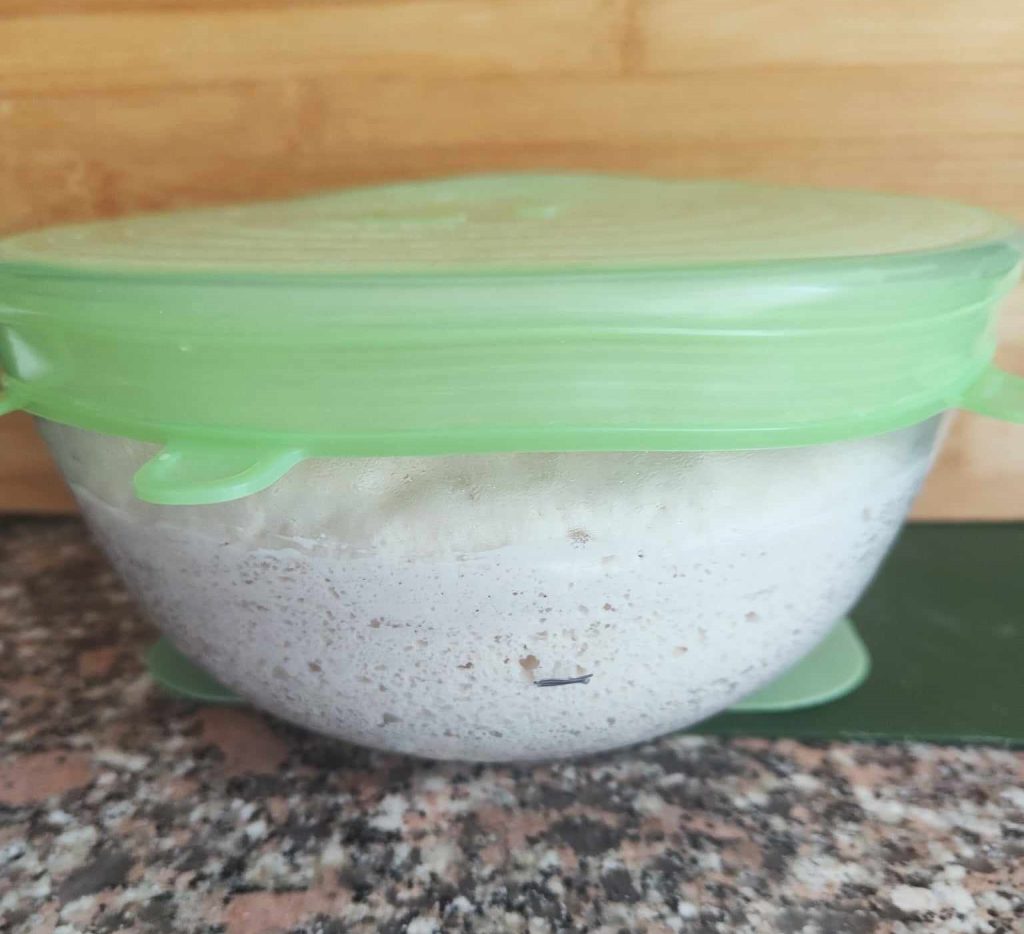 Recouvrez le bol avec un film plastique ou un couvercle en silicone, et laissez doubler la pâte. Cela prendra environ 1h30, en fonction de la température extérieure, mais elle gonfle et lève généralement rapidement.