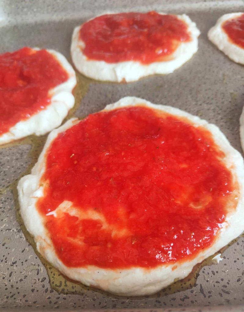 À la fin du temps de levée, une fois la pâte doublée, huilez une plaque avec de l’huile d’olive et prenez deux ou trois cuillerées de pâte, en la déposant sur la plaque. Avec la cuillère, donnez la forme ronde de la mini-pizza jusqu’au diamètre désiré. Je les fais de 14 cm et cela donne 5 mini-pizzas. Vous êtes libre de les faire à la taille qui vous plaît le plus.