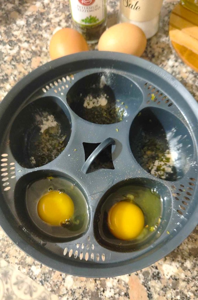 Couvrez le fond des conteneurs avec des herbes et des épices selon votre goût. Ajoutez également une pincée de sel.2 – Cassez les œufs :