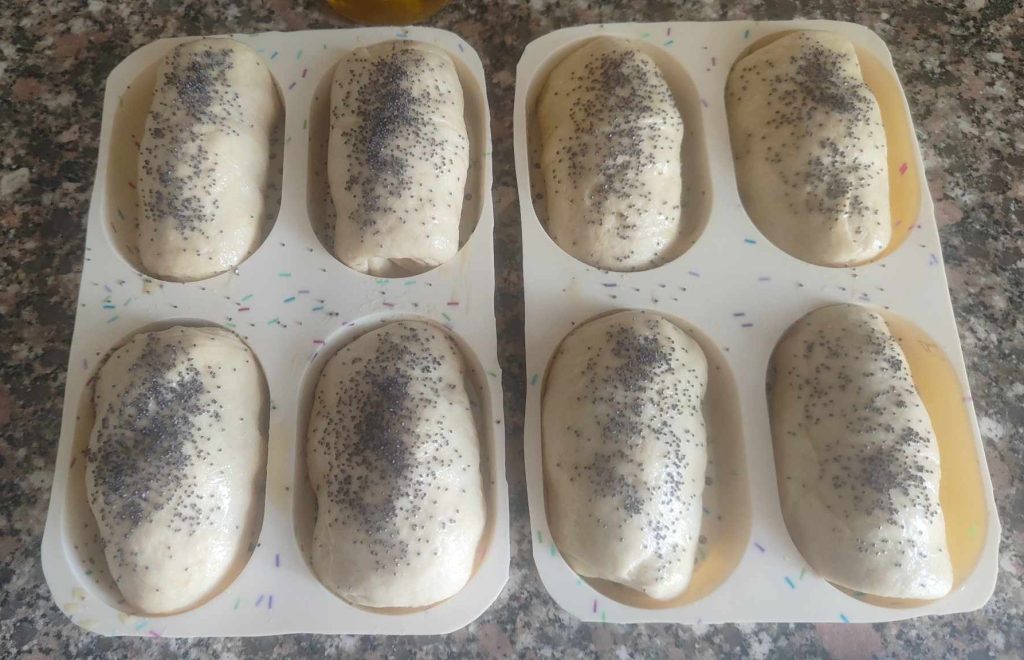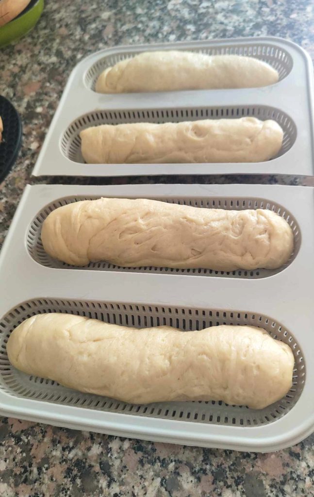 4 – Deuxième levée: Formez les pains (boules ou petits pains), déposez-les sur une plaque recouverte de papier sulfurisé ou dans des moules en silicone pour petits pains ou petites baguettes (comme celui sur la photo que j’utilise), et recouvrez-les pour la levée finale (~30 min).