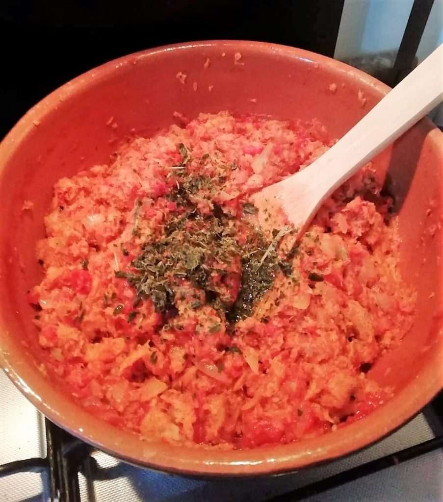 6 – Enfin, mettez les tranches de pain grillé, entières, dans la cocotte avec la tomate et laissez-les s’imbiber de sauce pendant 10/15 minutes.