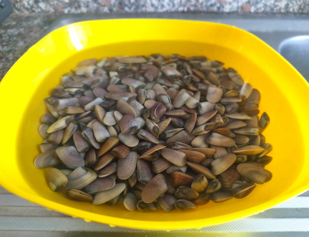 • Après le temps de purge du sable, égouttez les petites coques et rincez-les à l’eau.