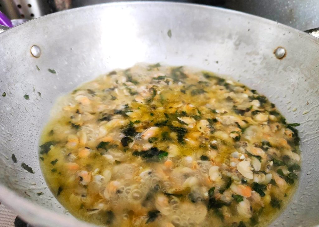 • Quand l’ail est doré, enlevez-le et ajoutez-y les petites coques décortiquées. Faites-les revenir quelques secondes, puis versez-y le vin blanc. Laissez-le s’évaporer puis ajoutez l’eau filtrée des petites coques.