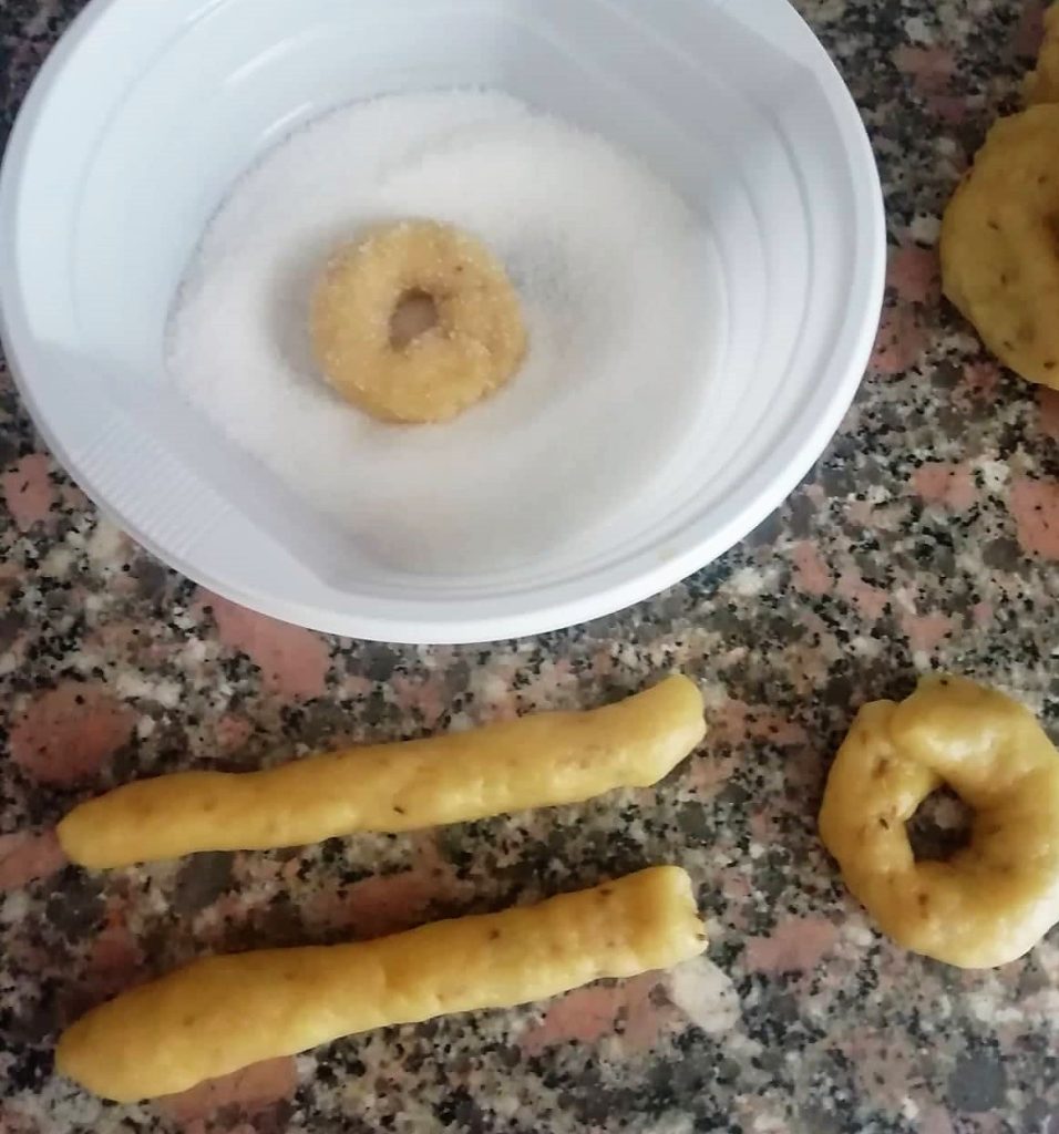 • Une fois le temps de repos écoulé, reprenez le pâton et pétrissez-le un peu sur le plan de travail. Ensuite, prenez de petites portions de pâte et formez des cordons tubulaires de 3/5 millimètres de diamètre. Fermez les deux extrémités sur elles-mêmes pour donner la forme de l’anneau et passez-les dans le sucre des deux côtés.