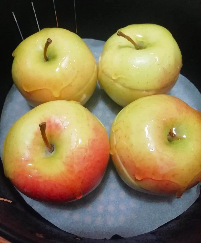 Placez les pommes sur du papier sulfurisé dans un plat, ou dans le panier de la friteuse à air. Badigeonnez-les d’une fine couche de miel et enfournez.