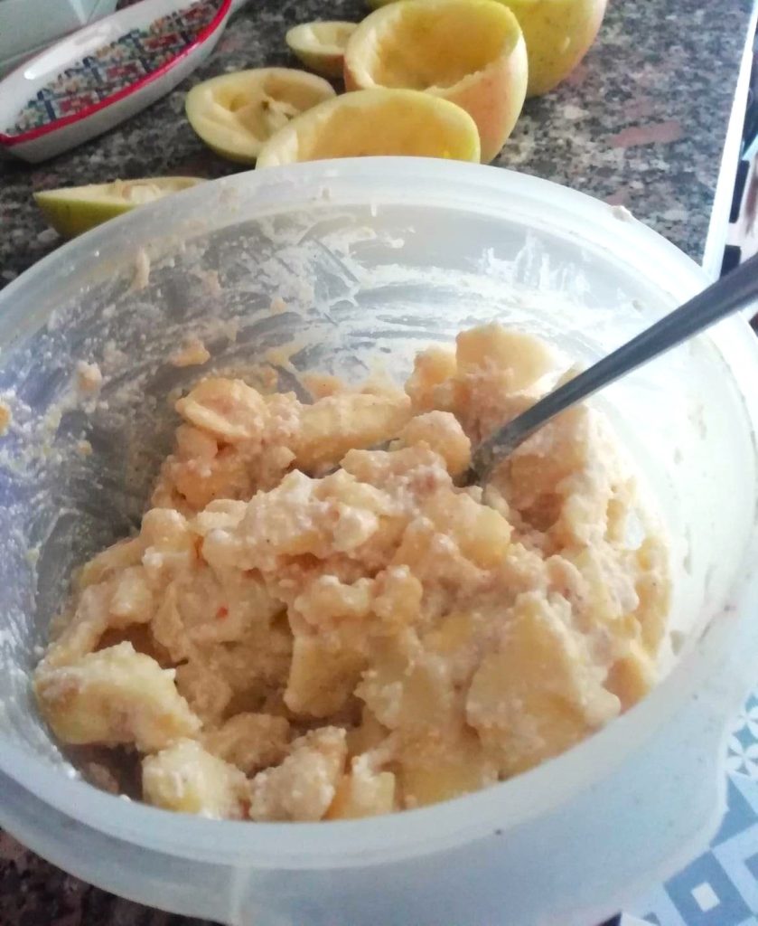 Hachez grossièrement la chair de pommes obtenue et ajoutez tous les ingrédients, le jus d’un demi-citron, le beurre mou, la chapelure, le miel, la cannelle, la pincée de sel, le zeste râpé de l’orange et du citron (à votre convenance) et l’extrait de vanille ou la vanilline.