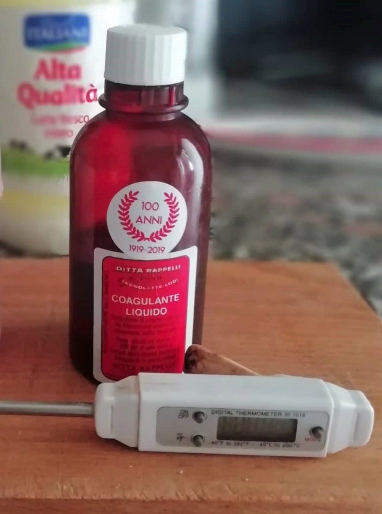 • Dans une grande casserole, en acier ou en cuivre, versez le lait et le sel et mettez-le sur le feu à basse température, pour atteindre la température maximale de 38/39 degrés. Remuez le lait pour dissoudre le sel et mesurez la température avec le thermomètre à immersion pour aliments.