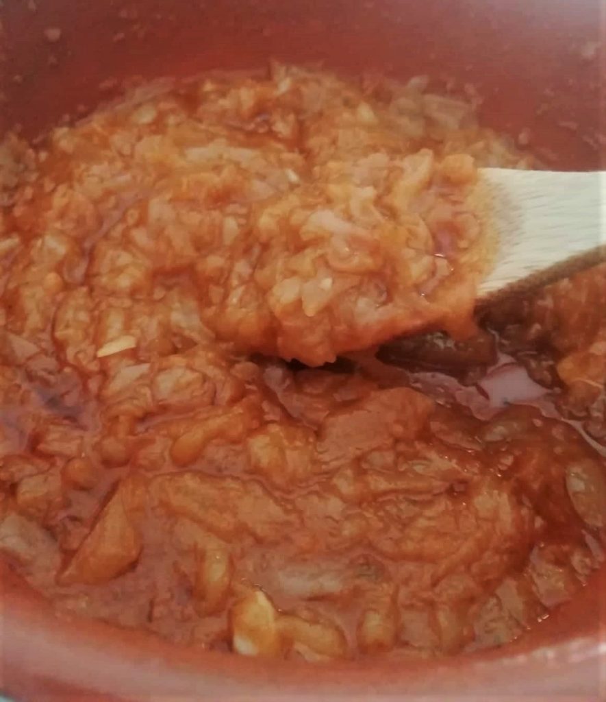 • Après 45 minutes, les oignons seront cuits et réduits dans leur eau, ajoutez le vin, le sucre, le concentré de tomate, le sel et le poivre à votre goût.