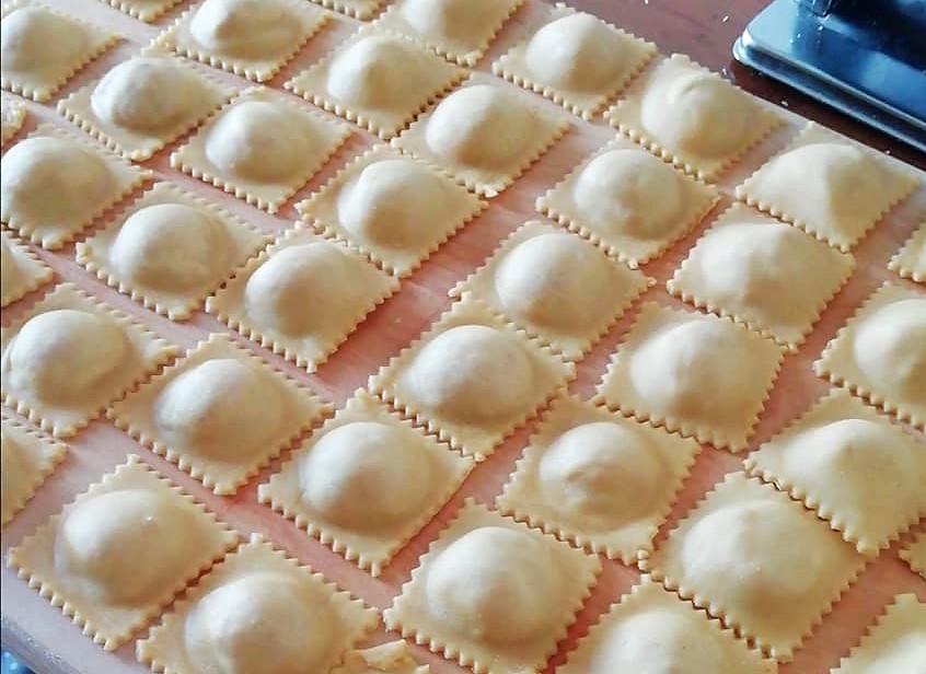 Pour obtenir 40 raviolis, vous aurez besoin de : 400 g de farine type 00 – 3 œufs frais – une pincée de sel – 1/2 petit verre d’eau (astuce de grand-mère : eau et un peu de vin blanc) et une poignée de semoule de blé dur à saupoudrer au-dessus et en dessous des raviolis.