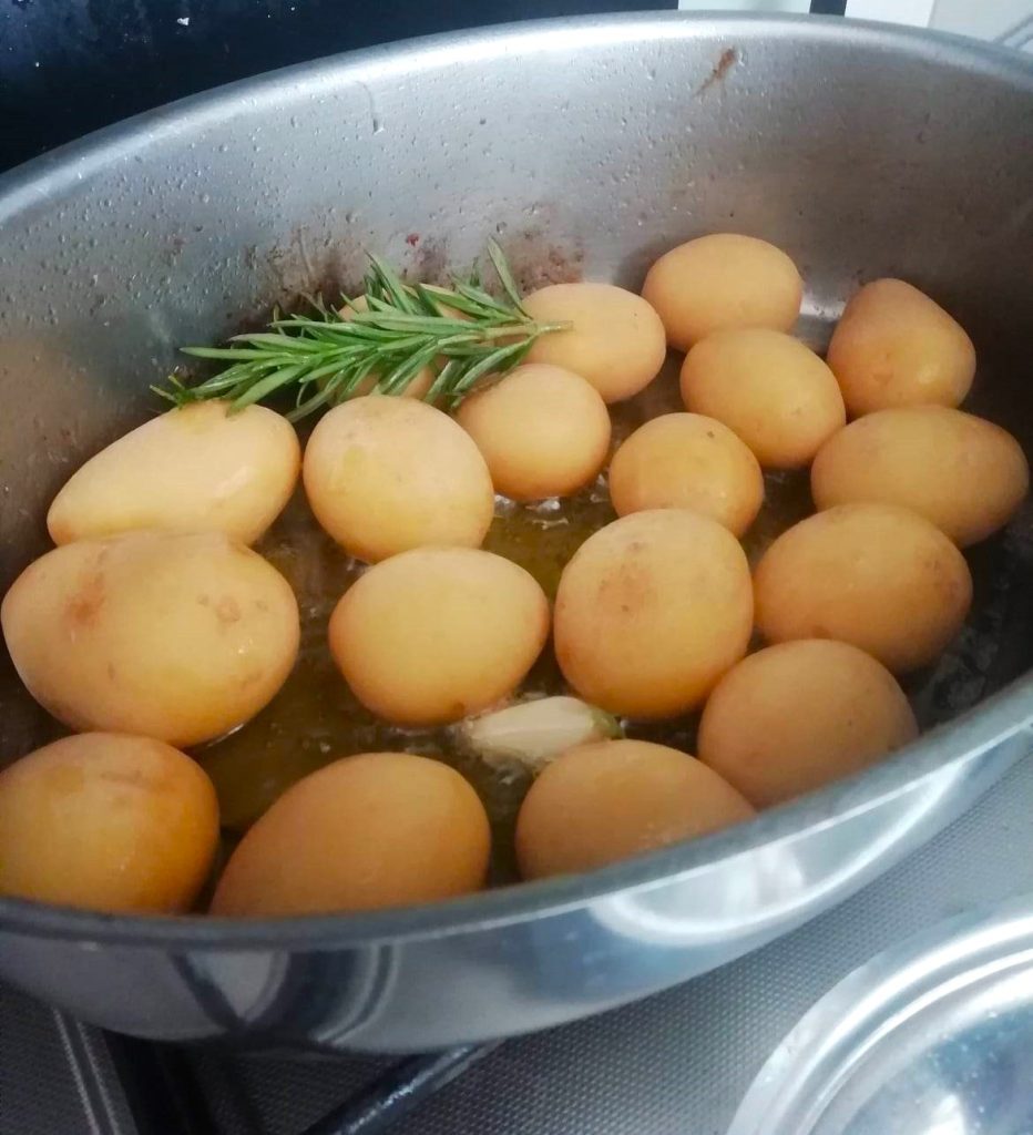Ajoutez les pommes de terre nouvelles et faites-les revenir dans la casserole pendant environ 30 minutes, jusqu’à ce qu’elles deviennent dorées et croustillantes.