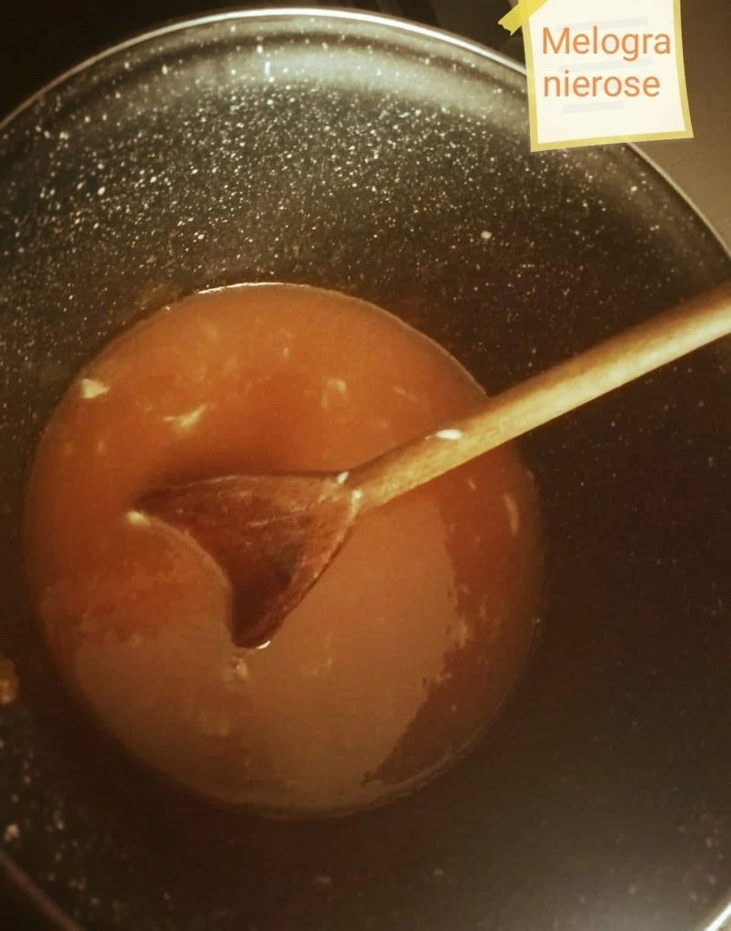 • Quand le sucre sera complètement fondu et deviendra d’une couleur légèrement ambrée, à une température de 155/165 degrés, éteignez la flamme et retirez-le du feu.