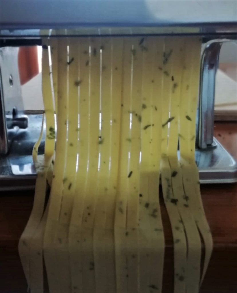Coupez la pâte en 4 parts et prenez-en une à la fois, commencez à l’étaler avec la machine à pâtes, appelée Nonna Papera. Passez la pâte plusieurs fois dans le rouleau lisse en commençant par 0 jusqu’à atteindre l’épaisseur 5. Saupoudrez les feuilles avec de la semoule de blé dur remoulue et laissez-les reposer pendant 10 minutes avant de former les tagliatelles.