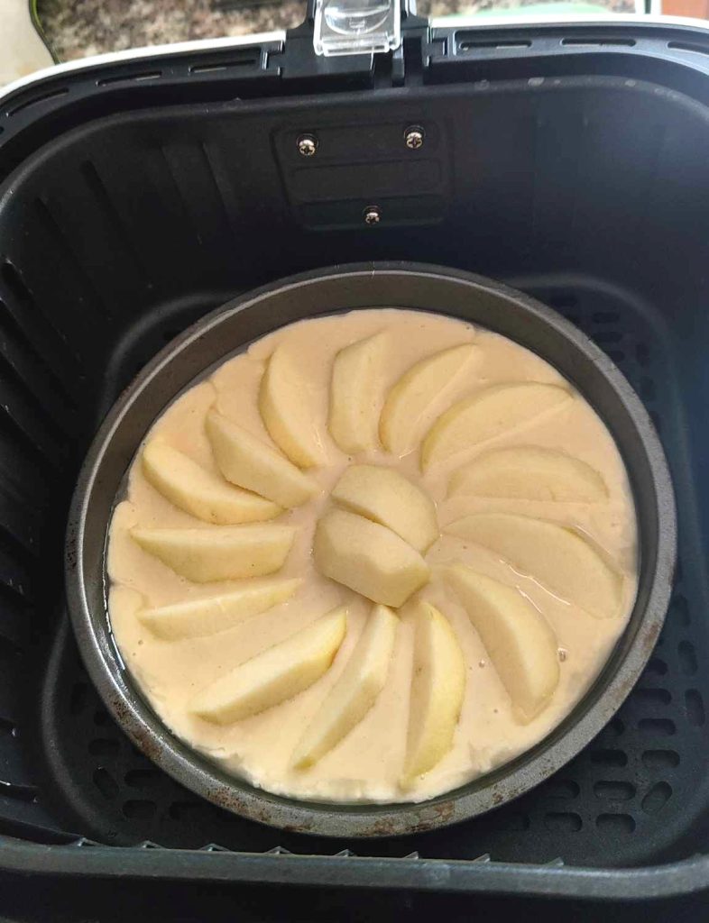 Dans la friteuse à air, les doses des ingrédients sont toujours réduites à moins de la moitié en raison des dimensions des moules et pour faciliter la cuisson inférieure de la tarte. En moyenne, les paniers des friteuses mesurent 20 cm x 20 cm et ont une résistance placée sur le dessus, il faut donc s’adapter à ces dimensions et savoir que la chaleur provenant du dessus sera ventilée de manière circulaire dans tout l’habitacle du panier avec la puissance en watts de la friteuse.