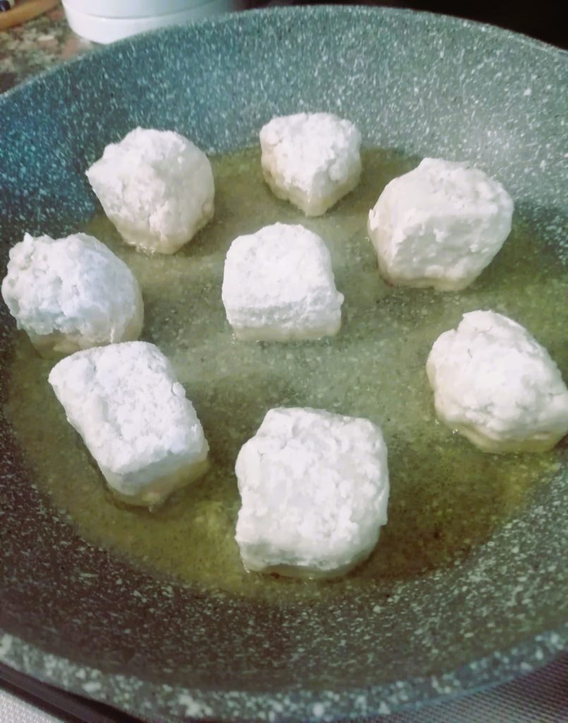 • Faites frire chaque côté du cube, jusqu’à ce qu’ils soient uniformément dorés. Tournez-les délicatement avec une pince pour ne pas les casser.