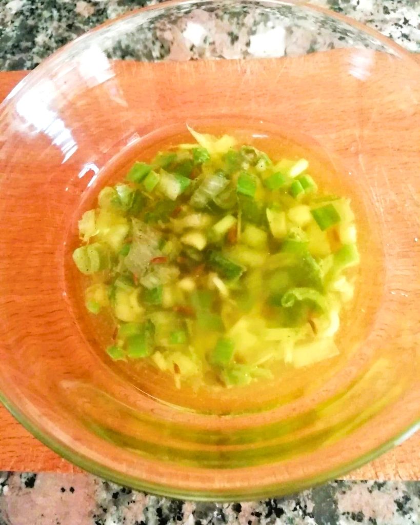 • Préparez d’abord l’huile à la ciboulette, en tranchant finement la tige verte et la partie blanche que vous mettrez dans un bol avec deux pincées de graines de cumin. Après avoir chauffé l’huile de tournesol dans une poêle, versez-la bouillante sur la ciboulette, mélangez le tout et laissez reposer dans le bol ou dans un bocal fermé.