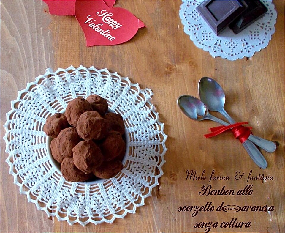 Aujourd’hui, je voudrais vous proposer de délicieux bonbons au chocolat aux écorces d’orange, idéaux en fin de repas, à servir avec le café, le thé, ou comme idée cadeau pour des moments spéciaux. Nous pouvons les réaliser à l’occasion de la Saint-Valentin (qui est à nos portes), pour la fête des pères et des mères. Ils sont formidables, très faciles, tendres à souhait, n’ont pas besoin de cuisson et ne contiennent ni œufs ni gluten. Ils peuvent être préparés bien à l’avance, car plus ils reposent, plus les ingrédients s’amalgament et expriment au mieux les parfums et saveurs. Ils se conservent au moins une semaine, bien fermés, dans un endroit frais.