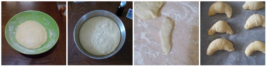 4) Une fois levée, renversez-la délicatement sur un plan de travail légèrement fariné et divisez-la en 6 ou plus de morceaux, selon vos besoins. Positionnez chaque morceau verticalement par rapport à vous et, en partant du haut, enroulez-le sur lui-même. En même temps, tirez progressivement les bords de la pâte vers l’extérieur. De cette manière, vous obtiendrez un croissant ou brioche, comme vous voudrez.