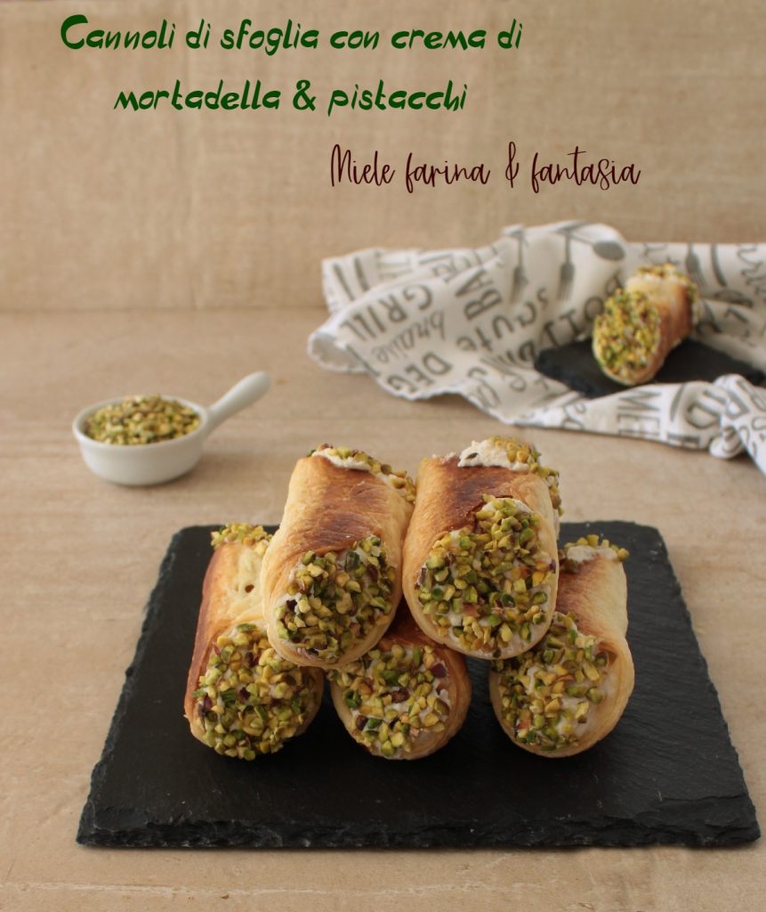 Les cannolis de pâte feuilletée à la crème de mortadelle et pistaches font partie de la catégorie des amuse-gueules finger food raffinés, parfaits pour les tables de fête, comme Noël, le Nouvel An, Pâques et les occasions spéciales. Ils peuvent également être servis dans un buffet comme amuse-bouche pour les apéritifs, en réduisant leur taille. Bref, avec quelques ingrédients simples, nous impressionnerons nos convives. Les cannolis de pâte feuilletée et la crème de mortadelle et pistaches peuvent être préparés bien à l’avance, en veillant à garder la crème au réfrigérateur jusqu’au moment de l’utiliser et à conserver les cannolis dans un sac alimentaire. Rappelons que les cannolis doivent être farcis seulement au dernier moment pour en préserver le croquant.