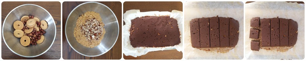 Hachons finement ensemble les biscuits et les noisettes, jusqu’à obtenir un mélange grossier et granuleux. Nous ne devons pas les réduire en poudre.