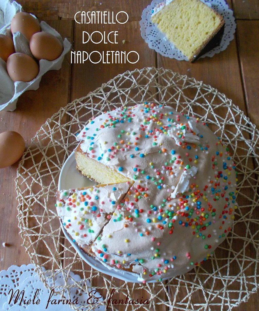 3) Passons à la troisième et dernière pâte. Ajoutons au deuxième mélange la farine restante (c’est-à-dire 200 grammes), les œufs restants (un à la fois), le sucre, le sel, le saindoux (que nous pouvons remplacer par 50 grammes de beurre très mou et travaillé en crème avec les dents d’une fourchette), les arômes, la liqueur. Comme tous les œufs n’ont pas la même taille et que toutes les farines n’absorbent pas les liquides de la même manière, il pourrait être nécessaire d’avoir quelques œufs de plus ou de moins par rapport à ce que j’ai indiqué. Dans mon cas, la pâte a absorbé au total 7 œufs moyens. La consistance finale de la pâte doit être très, très molle, presque liquide. Dès que tous les ingrédients sont parfaitement absorbés, transvasons la pâte dans le(s) moule(s) que nous aurons déjà abondamment beurré et fariné. Laissons-la lever jusqu’à ce qu’elle atteigne presque le bord du moule. Enfournez le casatiello doux à 180* pendant environ 60/70 minutes, dans le four déjà chaud. Il doit devenir uniformément ambré. Pour vérifier la cuisson, piquons le casatiello doux avec une brochette qui doit ressortir sèche. Lors des cinq dernières minutes de cuisson, préparons le glaçage royal.