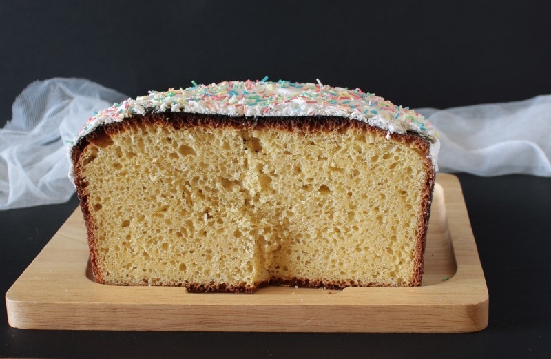 Aujourd’hui, je vais vous parler d’une autre recette typique de ma région, le casatiello doux. Eh bien, oui, il existe aussi une version douce du casatiello napolitain, même si, par type de pâte et d’ingrédients, elle a peu à voir avec son « cousin » salé. Chez moi, c’est une tradition de le préparer à la fois pour Noël et pour Pâques. C’est un dessert réalisé avec du levain, du sucre, des œufs, du saindoux (ou du beurre) et des arômes. Le tout est surmonté et décoré d’un glaçage gourmand et croquant de glace royale et de vermicelles colorés. L’intérieur du casatiello doux a une consistance moelleuse mais, en même temps, plus compacte et avec une aération plus serrée qu’un panettone de Noël (pour faire une comparaison). Dans la tradition de ma famille, les casatielli doux doivent être hauts et étroits; c’est pourquoi les moules utilisés ont une circonférence d’environ 22/24 cm de largeur et au moins 12/14 cm de hauteur. Nous pouvons tout de même utiliser les moules que nous avons déjà à la maison; ceux pour les gâteaux couronne conviennent parfaitement. Les seules deux modifications apportées à la recette originale de ma famille, en particulier de ma grand-mère, concernent l’utilisation du robot pâtissier à la place des mains et le type de farine. Ma grand-mère utilisait de la farine faible avec d’énormes problèmes de gestion de la levée, car une farine faible a un gluten faible, alors elle ne supporte pas les très longues levées. Cependant, grâce à sa longue expérience avec ce type de dessert et à son levain très, très fort, elle réussissait, avec quelques inquiétudes et « courses contre la montre », à réaliser des casatielli magnifiques, jusqu’à ce qu’elle « découvre » la farine Manitoba. Bonne lecture et bon casatiello doux.